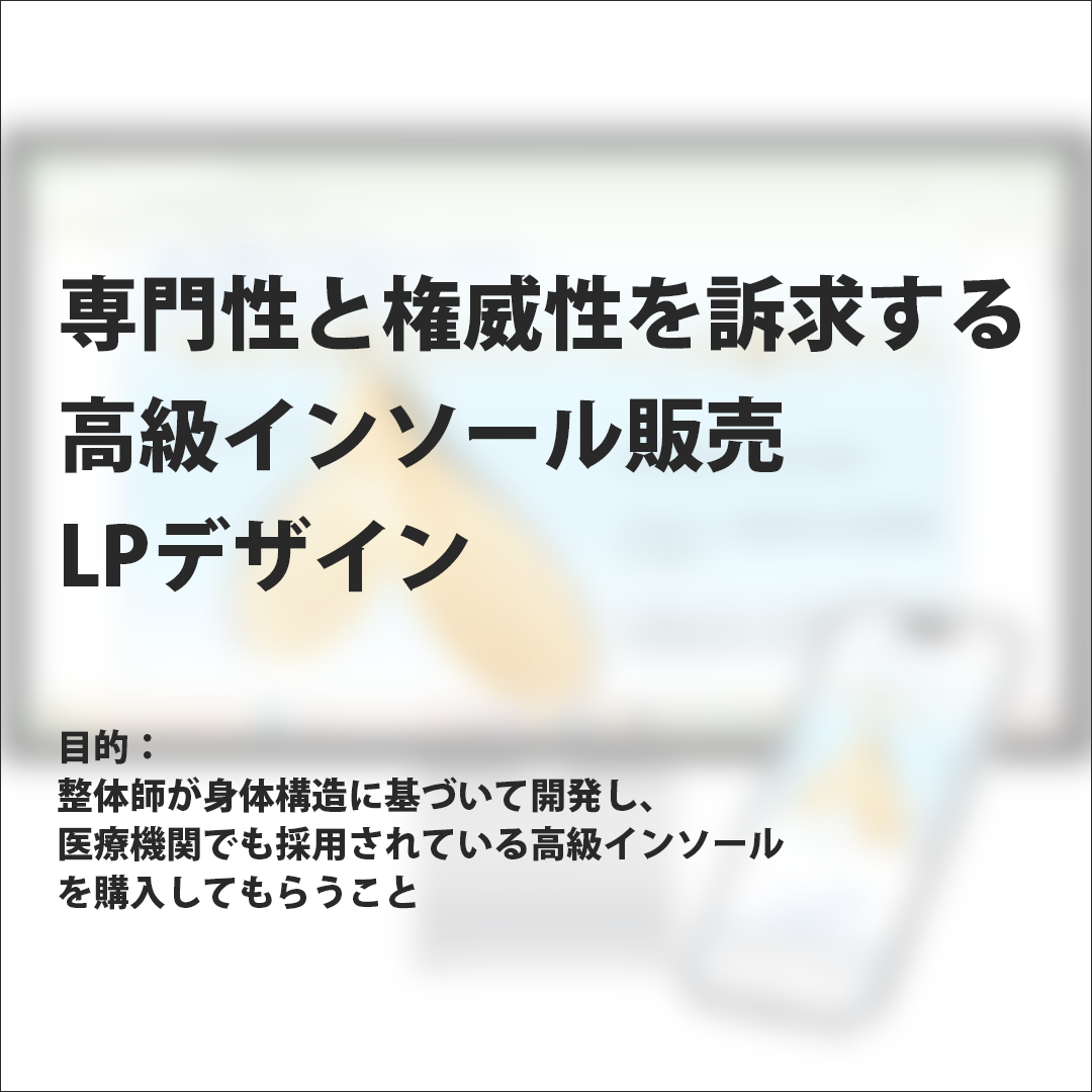 このランディングページの目的は、見る人に高級インソールを購入してもらうことです。商材であるインソールは、整体師の先生が身体の構造に基づいて開発したものであり、多くの医療機関でも採用されている品物となっています。そのため、「高級感」、「専門性」、「権威性」を感じさせるデザインを、とのディレクションをいただいています。