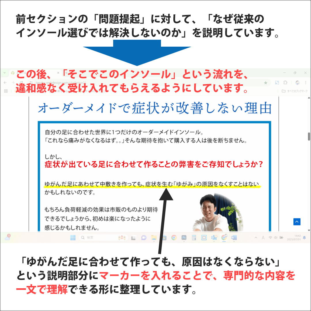 ファーストビュー以降につきましては、インソール選びに関する疑問を投げかけ、その後、従来のインソールの欠点を説明し、「そこで」と、商品を紹介。さらに医療現場での採用や、仕組みの説明などにより専門的な知見に基づく商品であることを印象付け、購入ボタンへ案内する、といった「導線」を意識してデザインしました。矢印やセクションの形状を工夫し、見る人の視線がスムーズに流れていくよう心がけました。また、テキストで装飾を施す箇所は、「つまみ読みしやすいように」という基準で選びました。