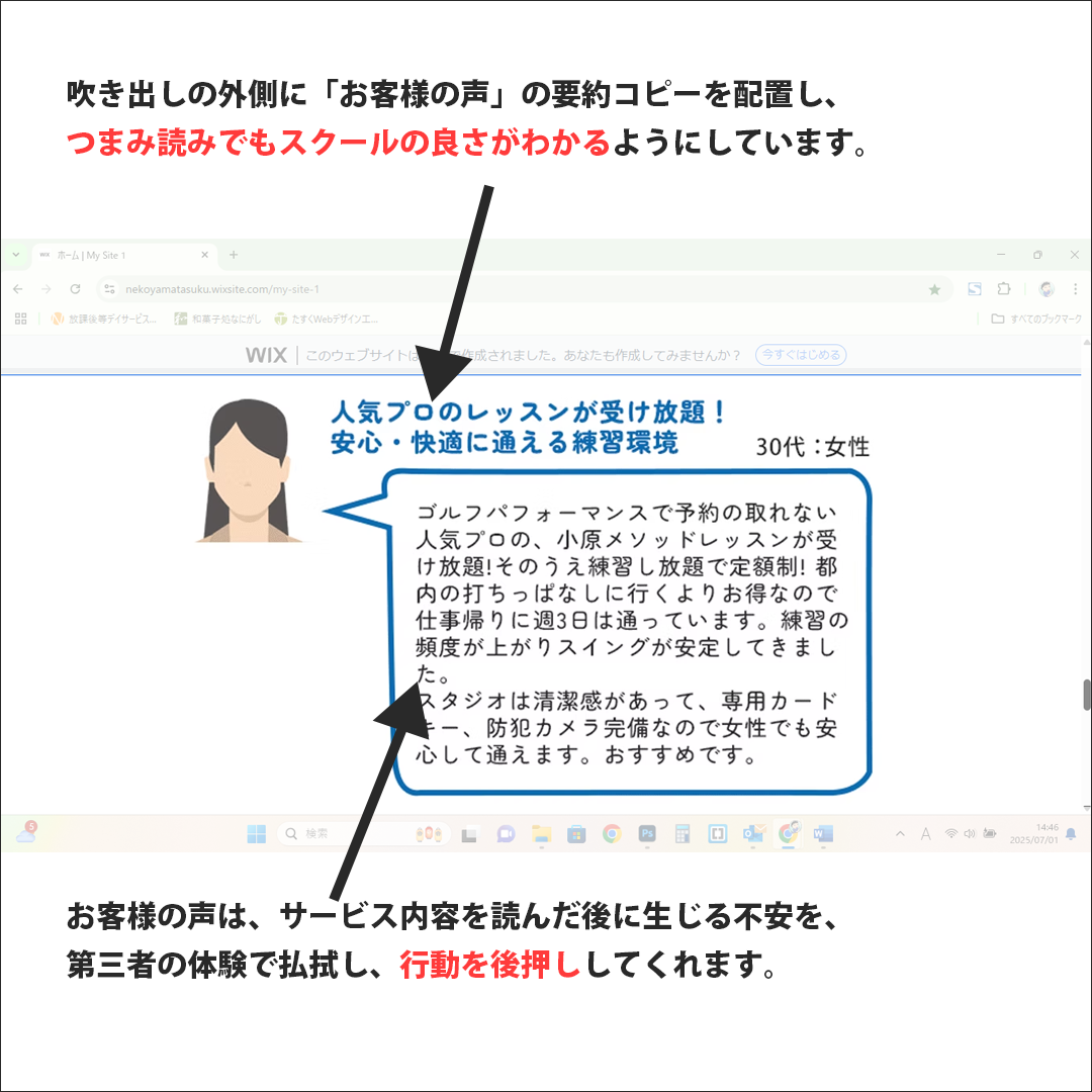 ファーストビュー以降は、スクールの詳細、実績、お客様の声、と続きます。お客様の声セクションは、見る人の背中を押す大事なセクションです。なので、吹き出しの外にコメントの要約を添えることによって、つまみ読みもできるように工夫しました。また、コンバージョンボタンは、見る人が押しやすいようにランディングページの序盤と終盤の2か所に設置してあります。