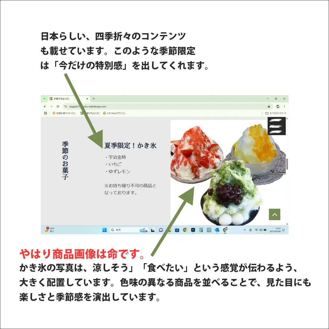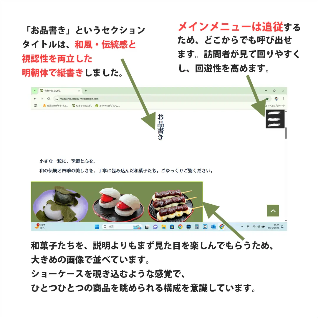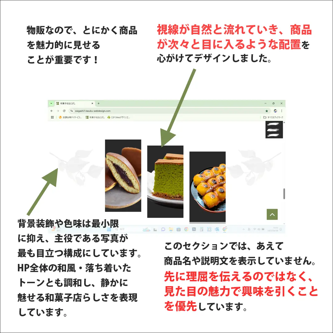 このホームページの目的は「和菓子店への集客」です。スムーズに予約や問い合わせができるよう、電話番号をトップと下部に表記し、スマホビューではボタンタップで電話を掛けられるようにしてあります。物販系のホームページなので、主役である商品画像を際立たせるよう意識しつつ、フォントや縦書きを用いて和風なデザインをしてみました。配色は全体的に黒や白を基調としつつ、ワンポイントカラーとして抹茶色を使用し、和菓子店らしさを出しました。