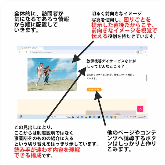 全体として温かで元気な雰囲気を醸し出しつつ、訪問者の目を引き、サービス内容をしっかりと伝え、見る人が見たいであろう情報は見やすいところに置いておき、終盤で背中を押す、といったように、ホームページを開いてから放課後等デイサービスにコンタクトをとるまでの流れを意識して作成してみました。