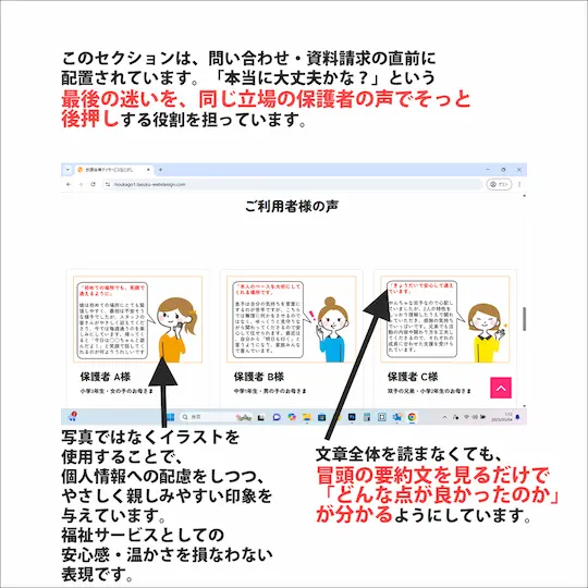 スクロールサインに従ってスクロールすると、「そもそも放課後等デイサービスとは何なのか?」や、「このサービス事業所の特色は何なのか?」、「利用できるまでの流れ」といった、見る人が気になるであろう情報はすぐに出てくるようにしました。さらに「ご利用者様の声」で背中を押し、最後には地図とともに、お問い合わせと資料請求の案内をもう一度表示しています。
