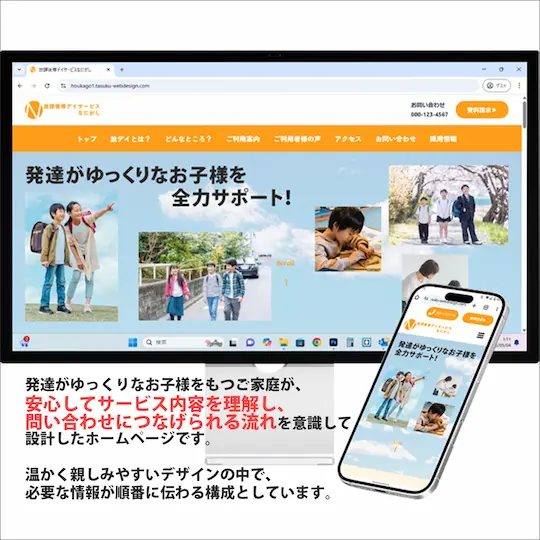 このホームページの目的は「利用児童・生徒の獲得」です。この目的に直結するパーツである電話番号の表示と資料請求ボタンは一番上に配置し、ページを開いてすぐ目に入るようにしました。スマホでは電話番号をタップすると電話アプリが起動するようにしています。配色に関しましては、福祉サービスのホームページということで、温かで親しみやすい橙色をメインカラーとしました。
