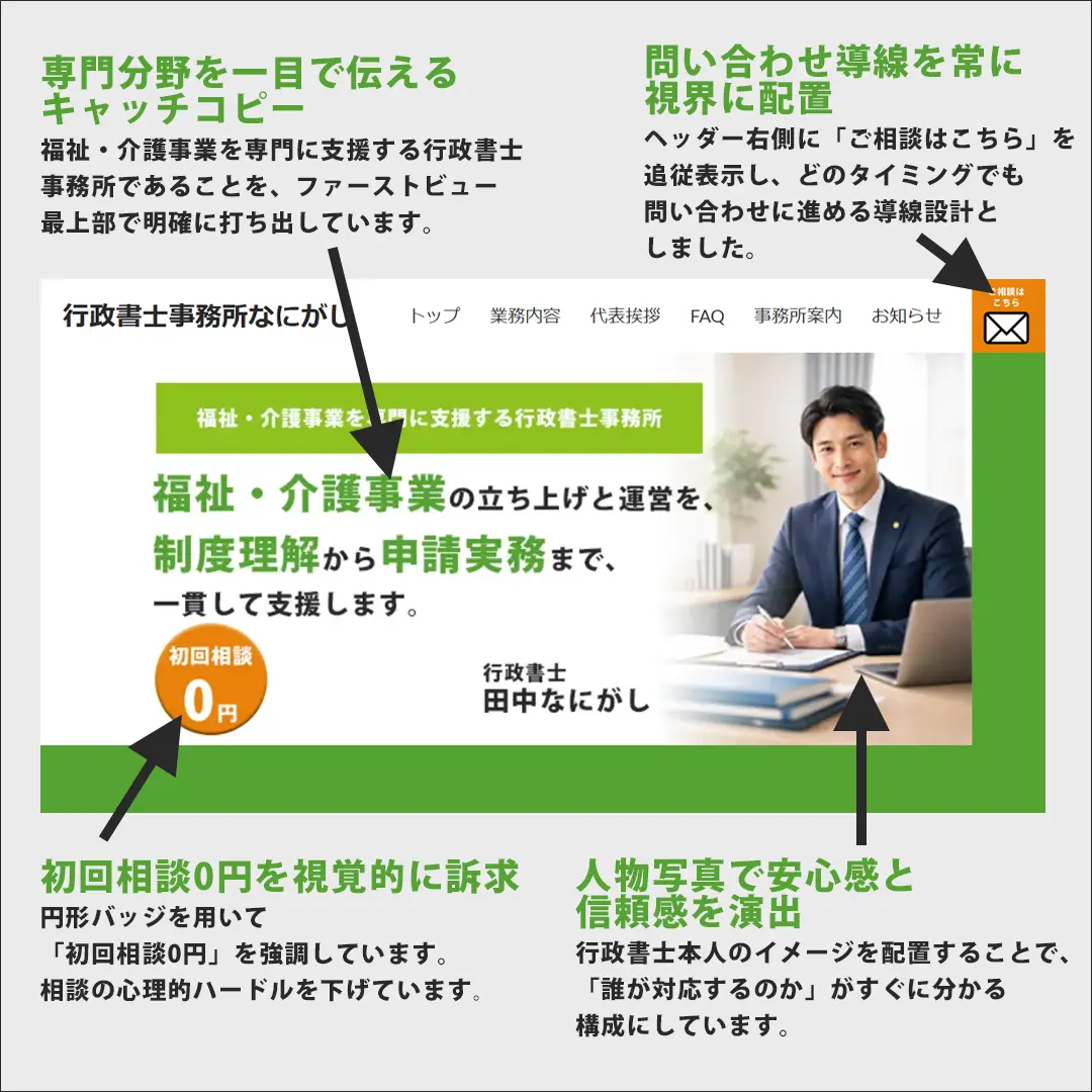 ファーストビューでは、「福祉・介護事業を専門に支援する行政書士事務所」であることを明確に打ち出し、訪問者が自分に関係のある事務所かどうかを瞬時に判断できる構成としました。また、代表者の顔写真や「初回相談0円」の情報を視覚的に配置することで、信頼感を高めると同時に、相談への心理的ハードルを下げる工夫を行っています。
