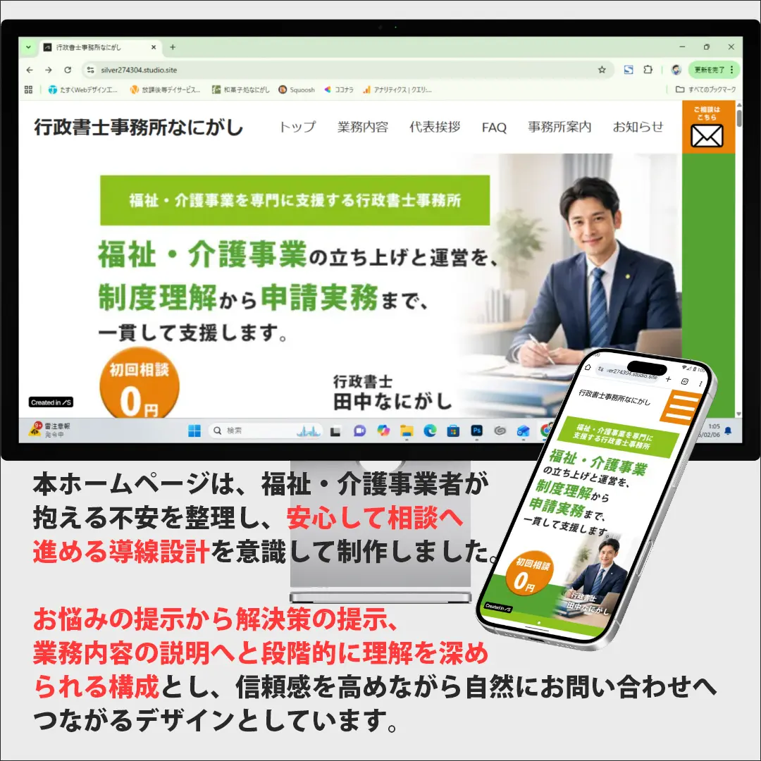 本ホームページは、福祉・介護事業者を専門に支援する行政書士事務所のホームページとして制作しました。福祉・介護分野は制度や申請手続きが複雑であり、事業者の方が不安や負担を抱えやすい領域です。そのため本サイトでは、「専門分野が明確に伝わること」と「安心して相談できること」を重視し、信頼感のあるホームページ設計を行いました。